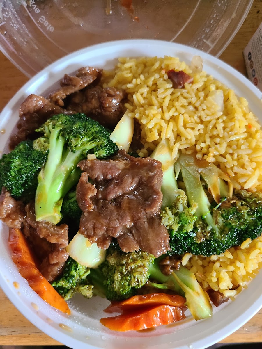 Got take out. Had the beef and broccoli combo. The beef and broccoli itself were pretty good. Tasty, good texture. The rice in the combo was pretty bland. Crab Rangoon was ok. They had chairs up and on the tables and full plexiglass dividing the kitchen and the counter. Reminded me of covid era....